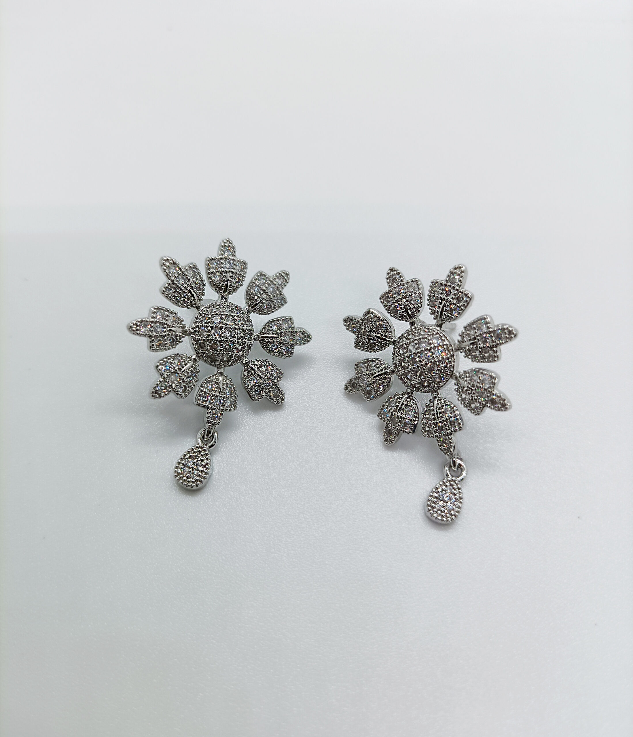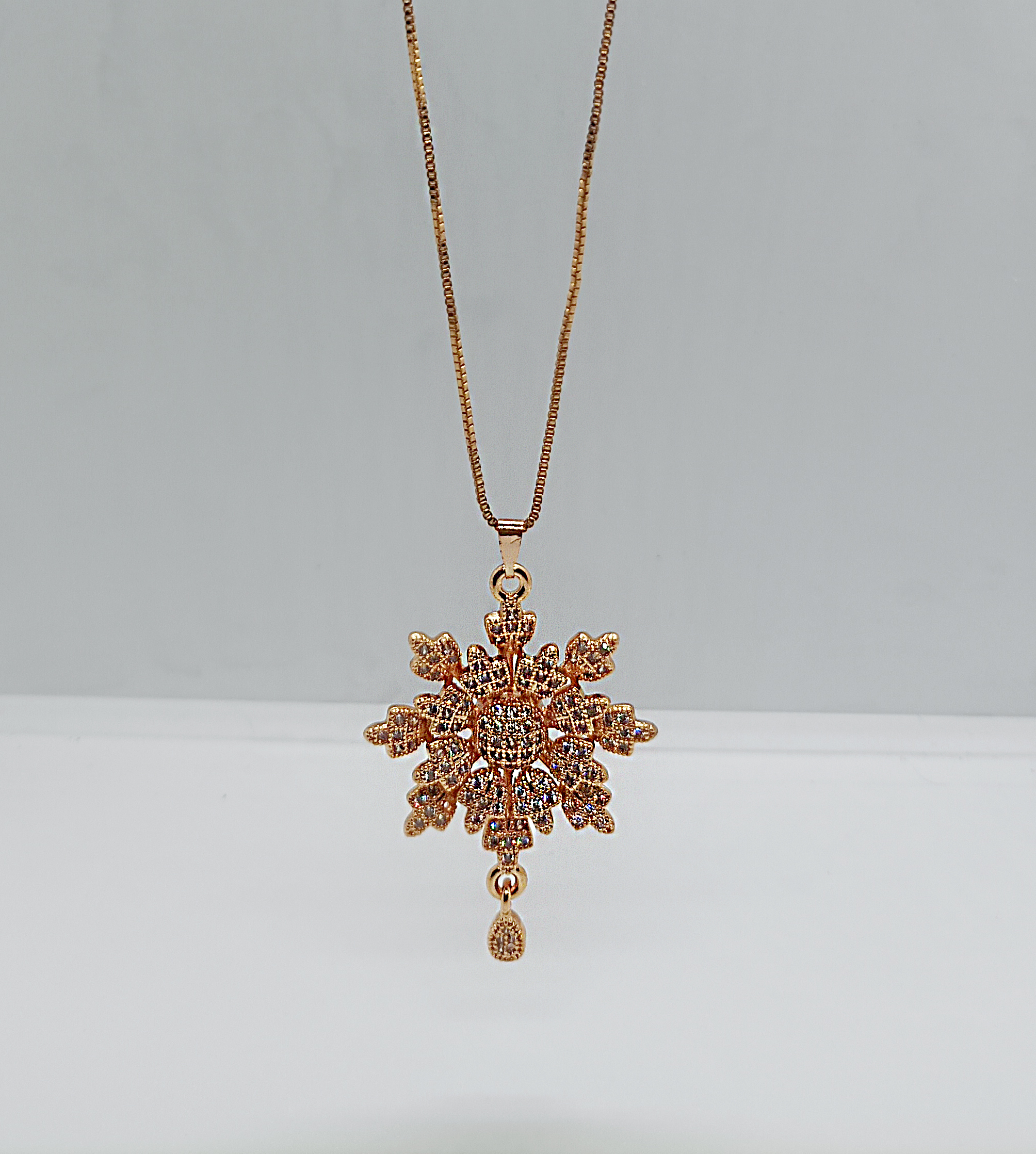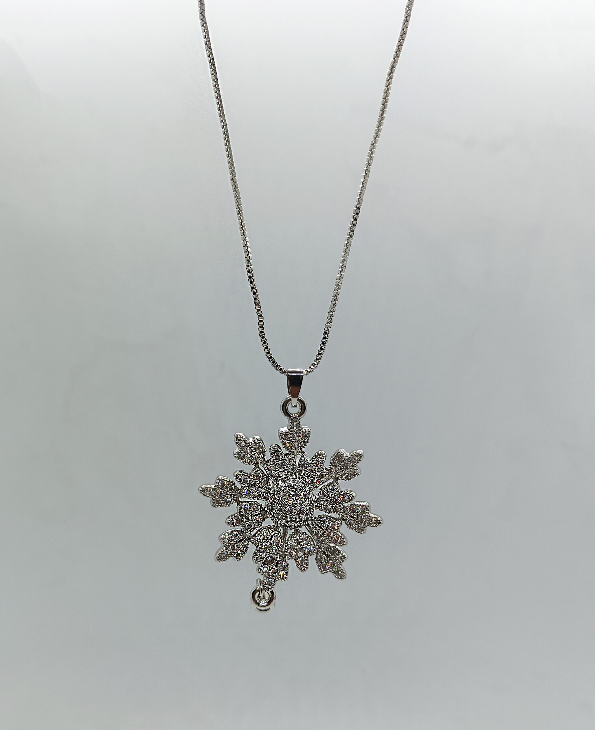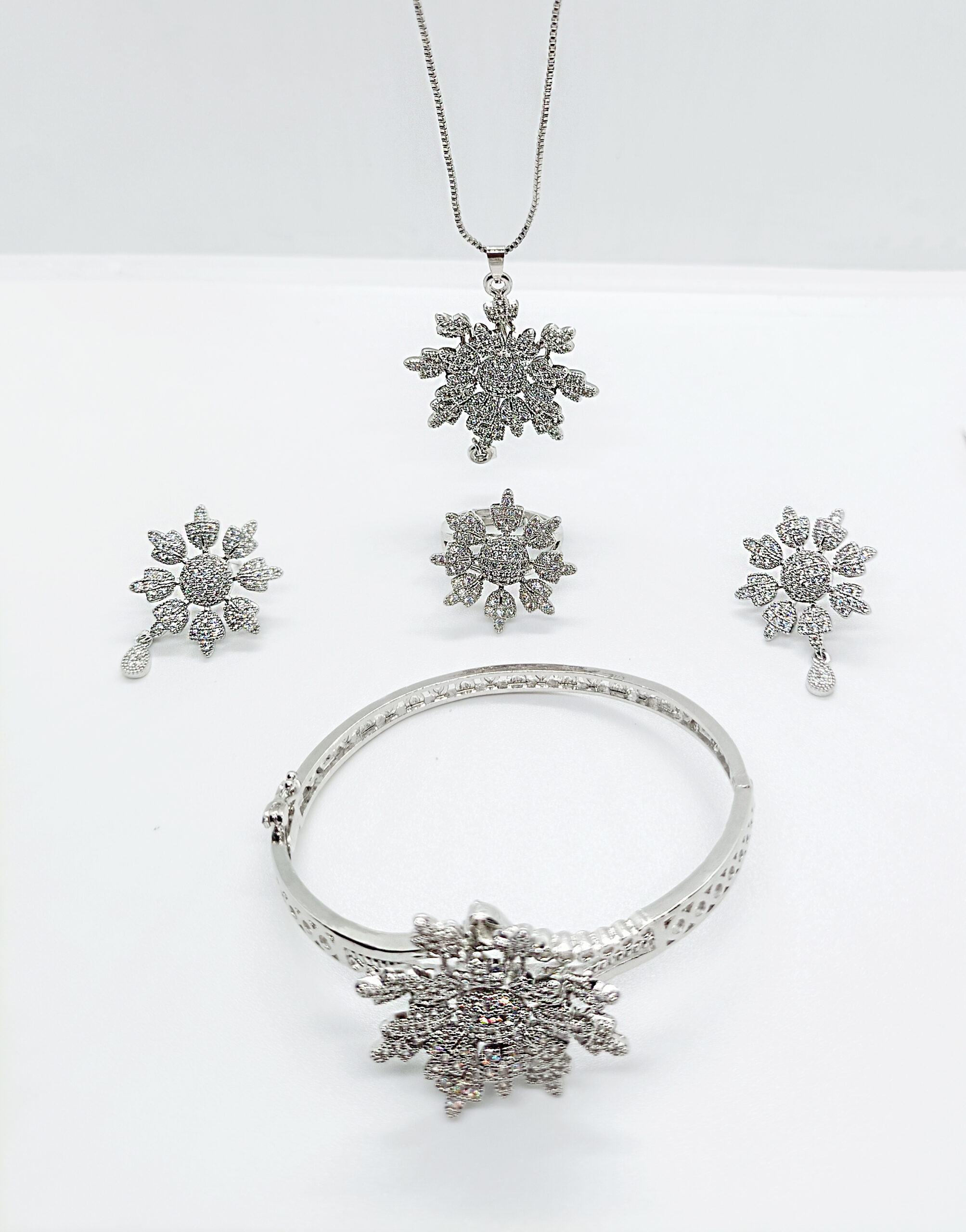 This exquisite set includes a radiant pendant with matching earrings, both crafted in a snowflake-inspired design and embellished with high-quality, brilliant-cut cubic zirconia stones.