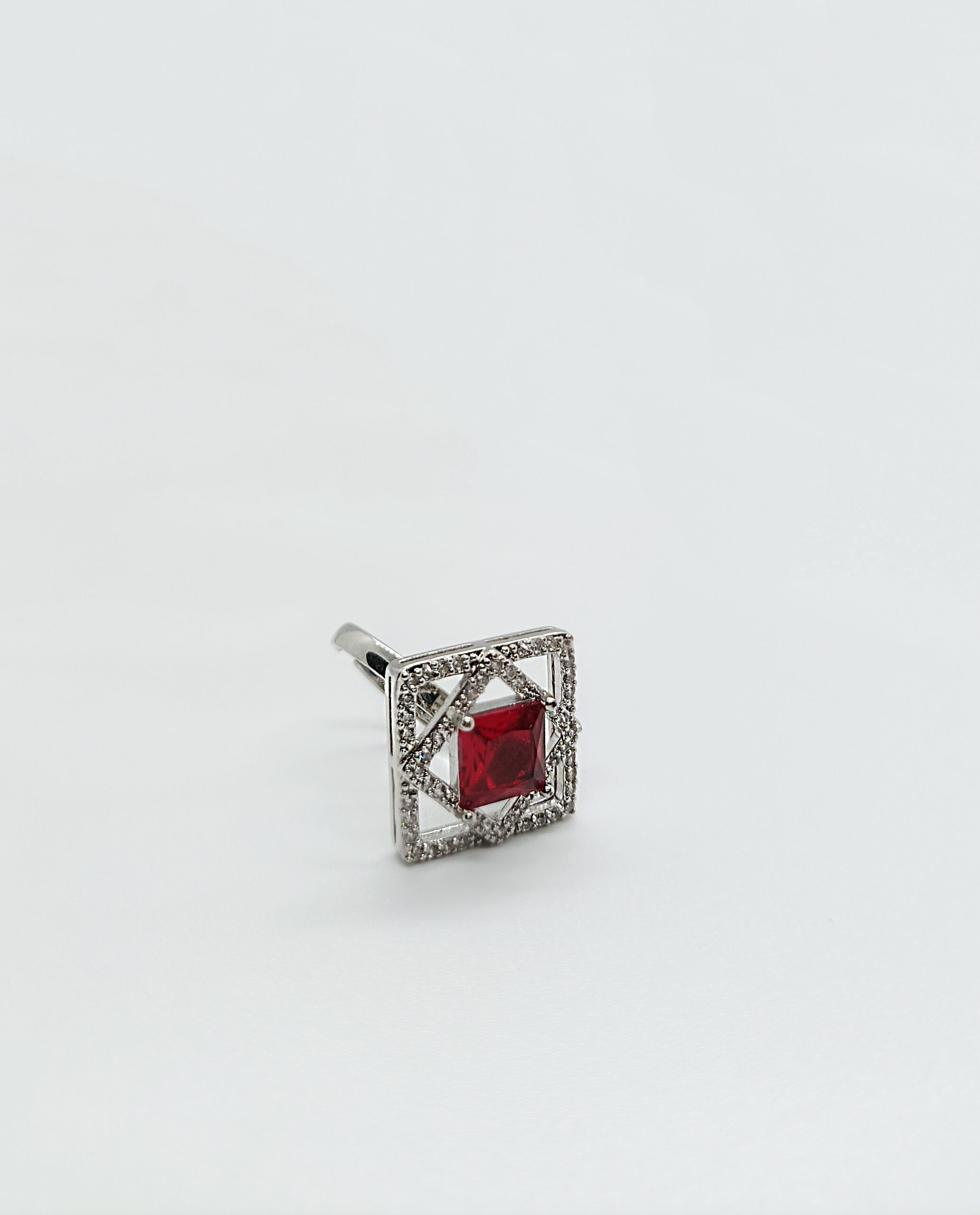 • The geometric frame surrounding the center stone is adorned with meticulously set white crystals, creating an architectural silhouette that blends modern sophistication with vintage flair. The diamond-within-a-square motif adds layers of symmetry and depth.
