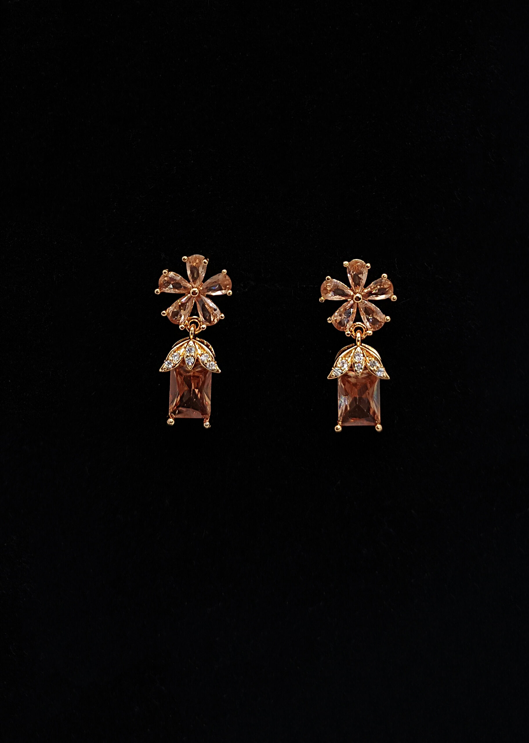 Sophisticated Drop Detail: Hanging gracefully below the floral top is a rectangular faceted crystal, framed delicately in gold-toned metal and accentuated with petal-shaped embellishments studded with tiny sparkling stones, creating a perfect balance of elegance and glamour.