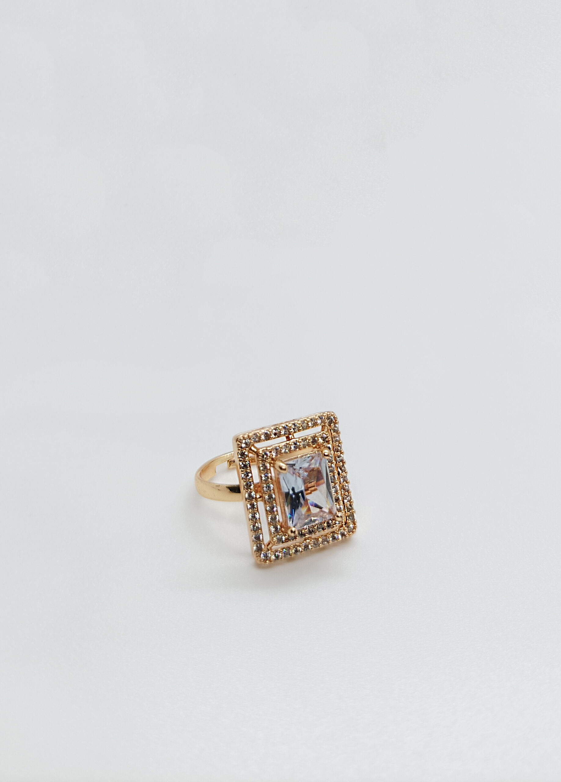 Surrounded by twin square halos of micro-set stones, the frame creates a mesmerizing depth—like a mirage within gold. The structured silhouette is elevated by the warm, lustrous tone of the gold setting, which adds richness without overpowering the central gem.
