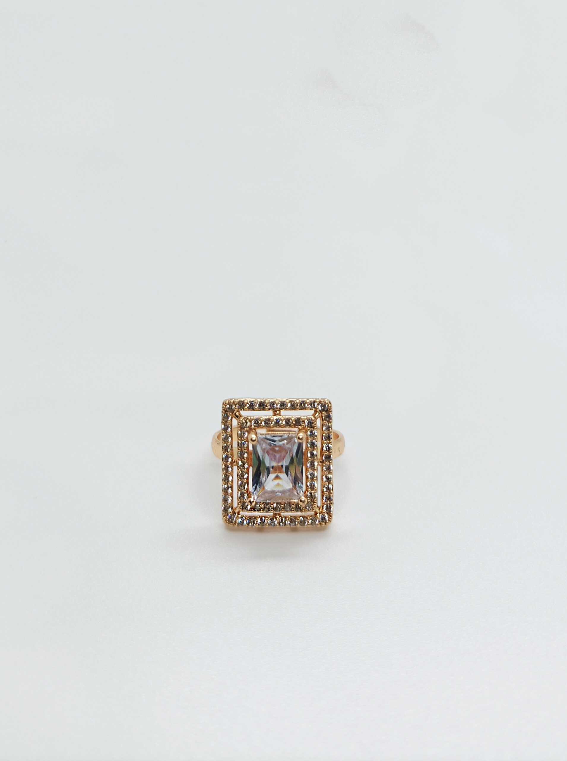 At its core lies a radiant rectangular-cut clear gemstone, carefully set to capture and reflect light with a dazzling brilliance. Its clarity and geometry lend the piece a refined and confident elegance, perfect for those who appreciate modern luxury with classic influence.