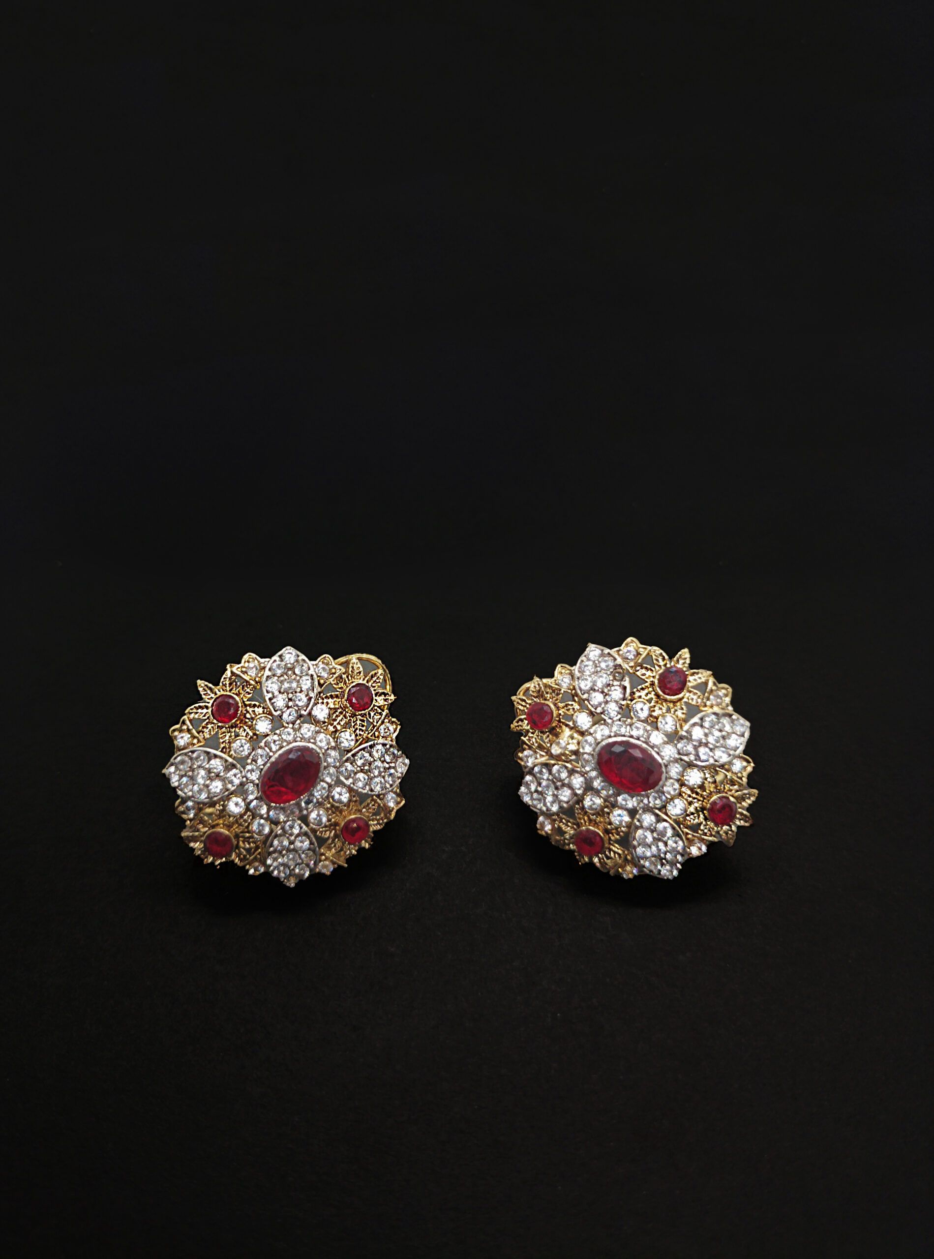Embellished with sparkling white stones and deep red ruby-toned gems, centered around an eye-catching oval gem for a luxurious and elegant look.