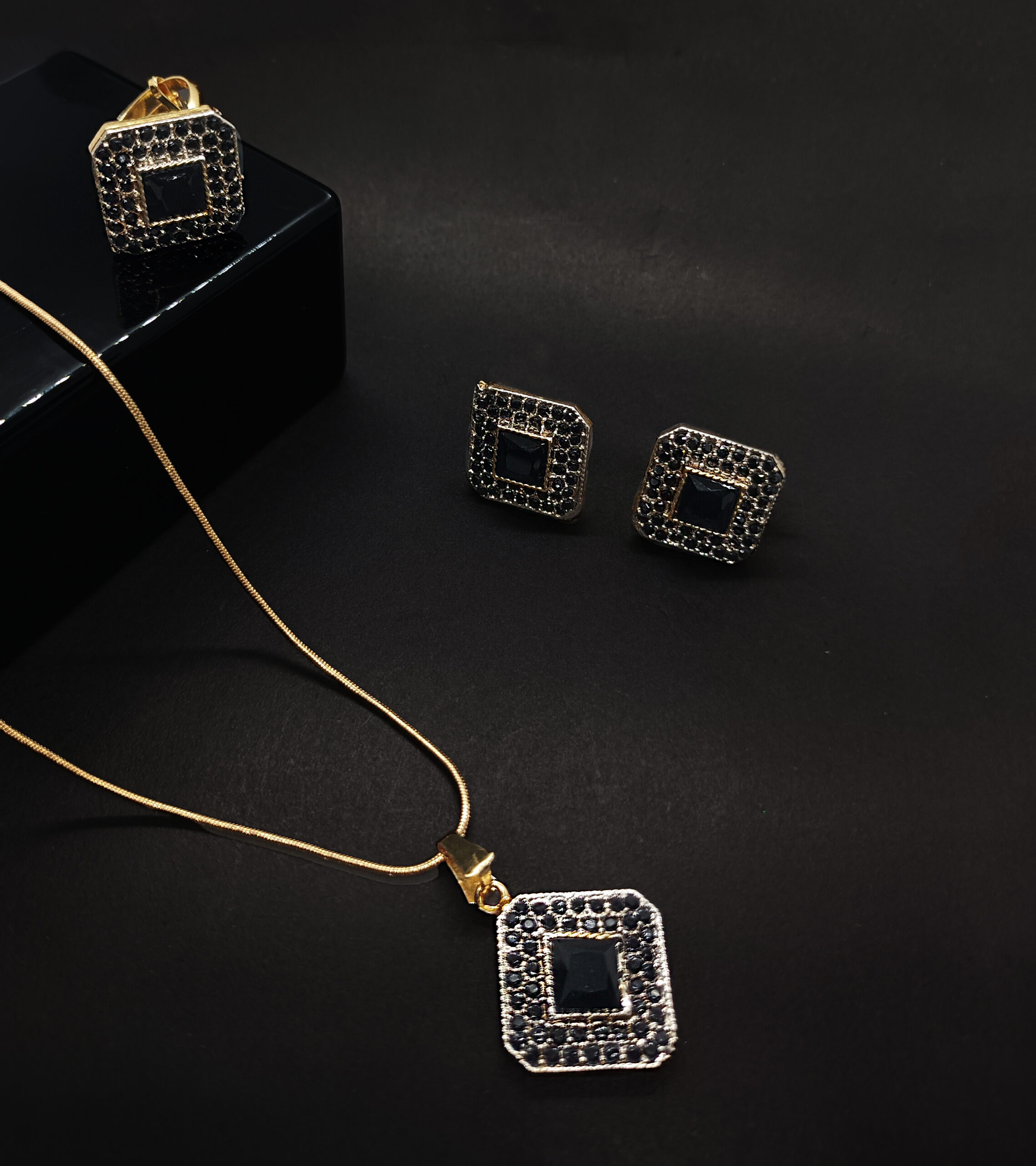 A bold and sophisticated handmade jewelry set featuring a geometric square design, centered with a deep black stone for a modern luxury statement.